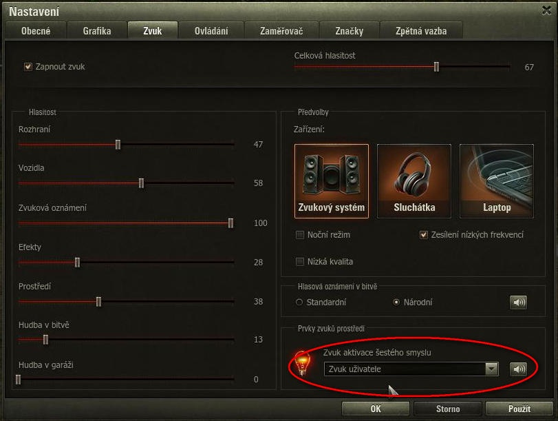 Nezapomeňte si v nastavení nastavit uživatelský zvuk: